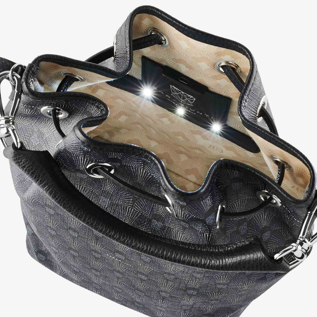 Mini bag da donna in raffinato canvas di cotone waterproof stampato con motivo 289 fan ispirato ai decori dell’art decò.Il modello iconico della collezione, pensata per seguirti ovunque e riporre gli oggetti essenziali di ogni giorno, versatile, sportiva e raffinata. ...