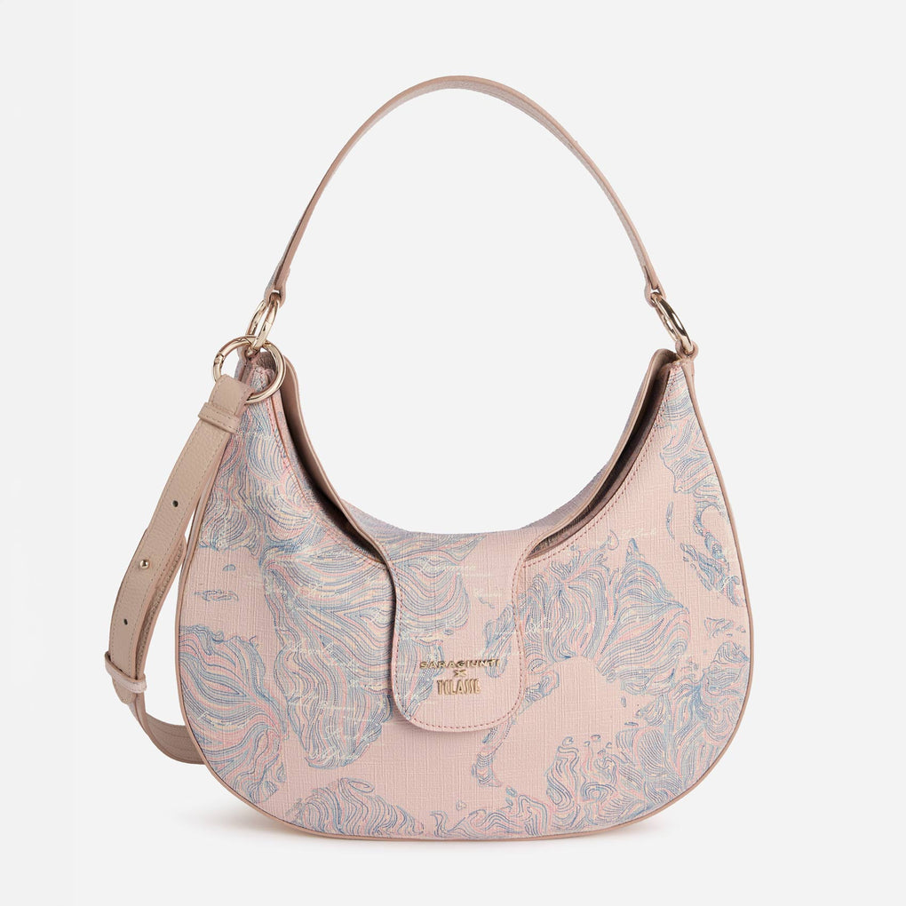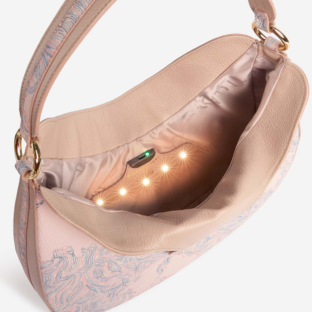 The iconic elegance of 1ᴬ Classe and the fashion-tech soul of Saragiunti meet in this large hobo bag. Smooth nappa leather gives it a fine, minimal and versatile look, embellished with the 1ᴬ Classe x Saragiunti logo and the metal tag on the bottom with Geo map in light gold. The interior light, to be activated by touching the logoed patch, is a valuable ally for always finding what you need. The bag can be transformed into four different solutions: you can wear it crossbody or under-shoulder thanks to the removable shoulder strap and shoulder strap, or flaunt it by hand by joining the gold maxi rings together. In the latter version, you can also pass the shoulder strap under the gold maxi rings and close it in a circle, turning it into a handle for practical, versatile and original wearability. Innovative in every aspect, it is a true emblem of contemporaneity, designed for those who follow the metropolitan rhythm with dynamism and elegance.
