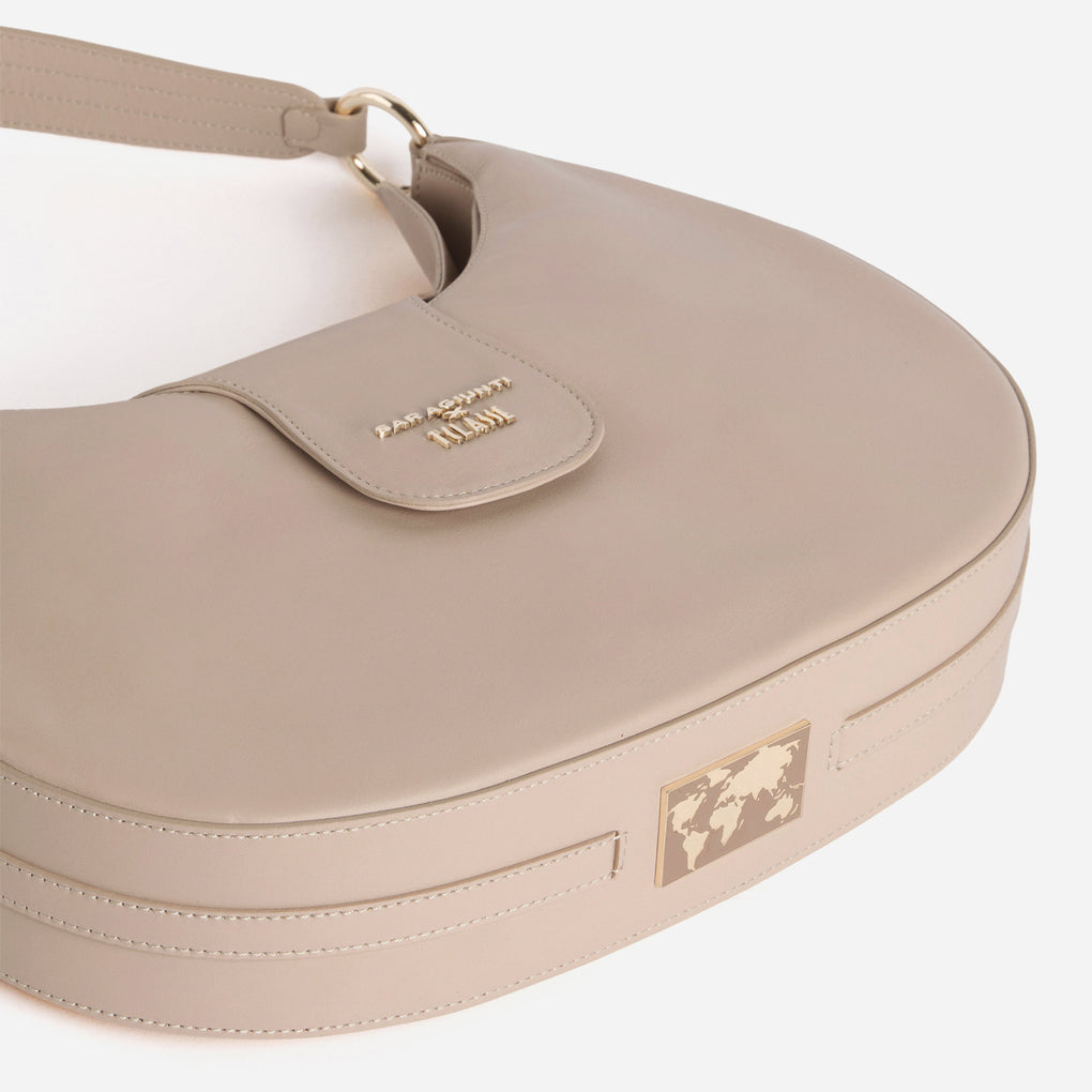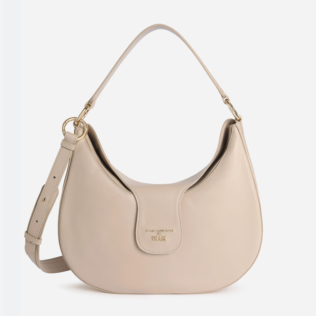 The iconic elegance of 1ᴬ Classe and the fashion-tech soul of Saragiunti meet in this large hobo bag. Smooth nappa leather gives it a fine, minimal and versatile look, embellished with the 1ᴬ Classe x Saragiunti logo and the metal tag on the bottom with Geo map in light gold. The interior light, to be activated by touching the logoed patch, is a valuable ally for always finding what you need. The bag can be transformed into four different solutions: you can wear it crossbody or under-shoulder thanks to the removable shoulder strap and shoulder strap, or flaunt it by hand by joining the gold maxi rings together. In the latter version, you can also pass the shoulder strap under the gold maxi rings and close it in a circle, turning it into a handle for practical, versatile and original wearability. Innovative in every aspect, it is a true emblem of contemporaneity, designed for those who follow the metropolitan rhythm with dynamism and elegance.