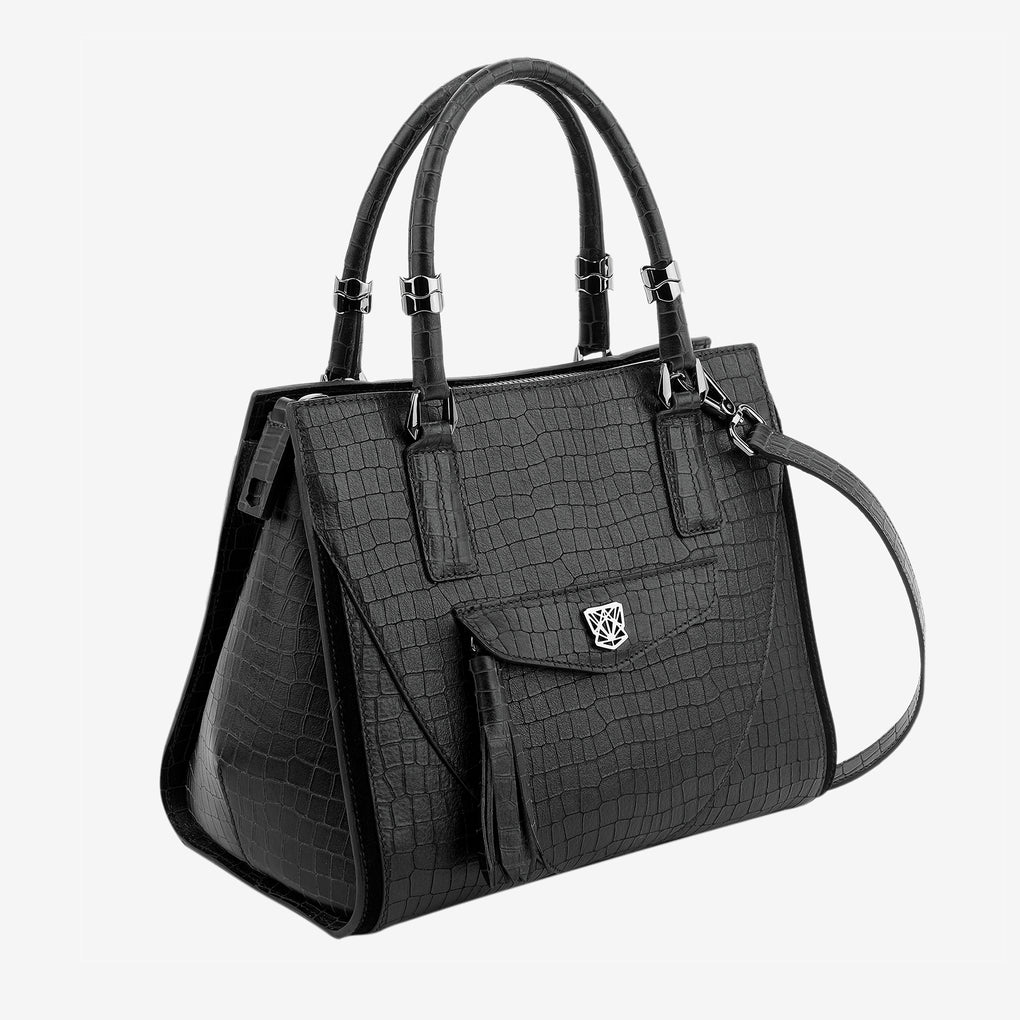 La borsa a mano di medie dimensioni New entry della collezione. Grazie al manico e la tracolla removibile può essere portata a seconda delle occasioni come meglio si preferisce Dall’apertura ampia e pratica, è dotata di una tracolla in pelle Intarsi in suede...